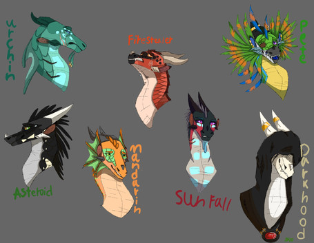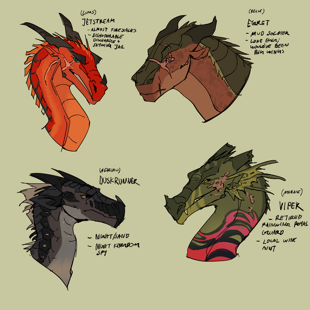 The title is accurate. I drew three random characters from Wings Of Fire! These were lots of fun- I loved experimenting with the shape of their faces! Tempest is a really cool underrated character from the Assassin Winglet; it’s unfortunate that she was killed off so quickly. I think it’s odd how the wiki made Tempest green,, when she was very clearly described to be turquoise. They also completely forgot about that rad trident strapped to her back. Oh well.. I love how she’s a big and stoic and hearty commander; and it’s crazy to think about how she could’ve easily enabled Burn to win the war with her aid. Dammit Deathbringer...