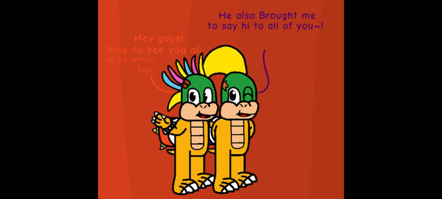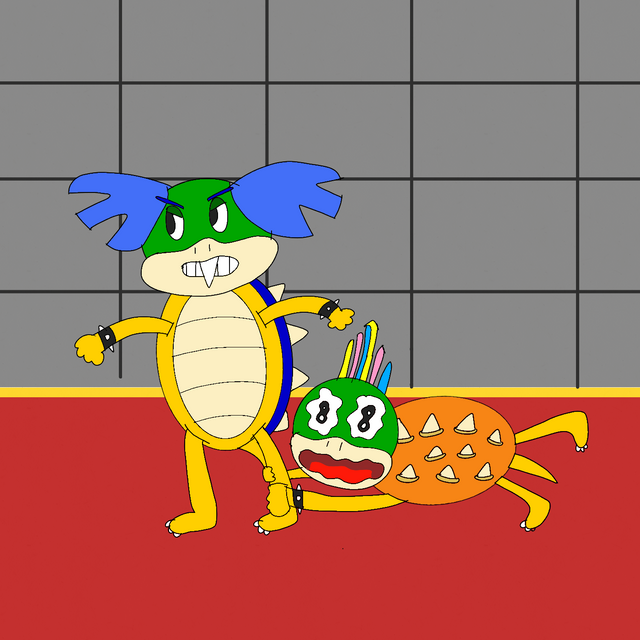 Personality and backstory: Lenny started off as the stupidest and weirdest koopaling alive. He always obsessed over lolipops, or as he called them, lolepops. He always waisted his time annoying people... and yeah, in other words, he’s that one kid at your school that you wish you could shut up. After a few years people started getting angry at Lenny. He was so stupid and annoying for his age. (But it kinda makes sense cuz he’s at the age of a squeaker.) Anyway, Lenny realized what he’s been doing and he decided to make a change. Now, he’s a lot nicer, not annoying or stupid, and has several friends throughout the castle. He can still be a drag sometimes, and he still loves lolipops, but he’s much better than what he used to be.