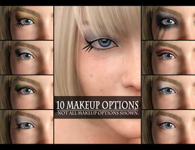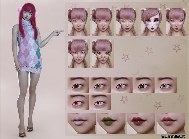 2. As you can see on this image, and the included Reference.jpg in the download, there are multiple face, eye and lip texture variations available. They are all stored in optional items and their names there are the same as written above (and on Reference.jpg). This should save you the time clicking through all of them. In order to make them display properly disable the Head-01 and Eyes-01 ones first though. Your pose (aka customization) will appear on all faces equally.