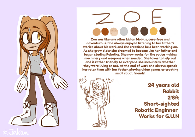 Her backstory is that she's an orphan and she's from a universe where Eggman rules over Mobius. She lives in hiding on the run with her chao Lucky to avoid getting captured by badniks. One day Shadow saves her and Rouge convinces him to take her in.