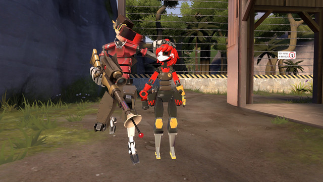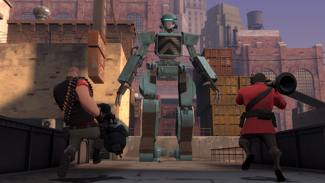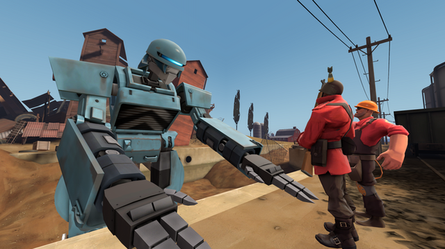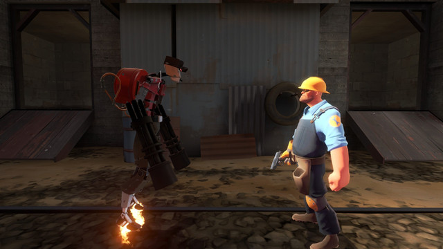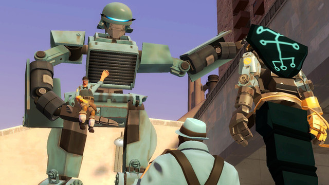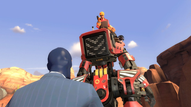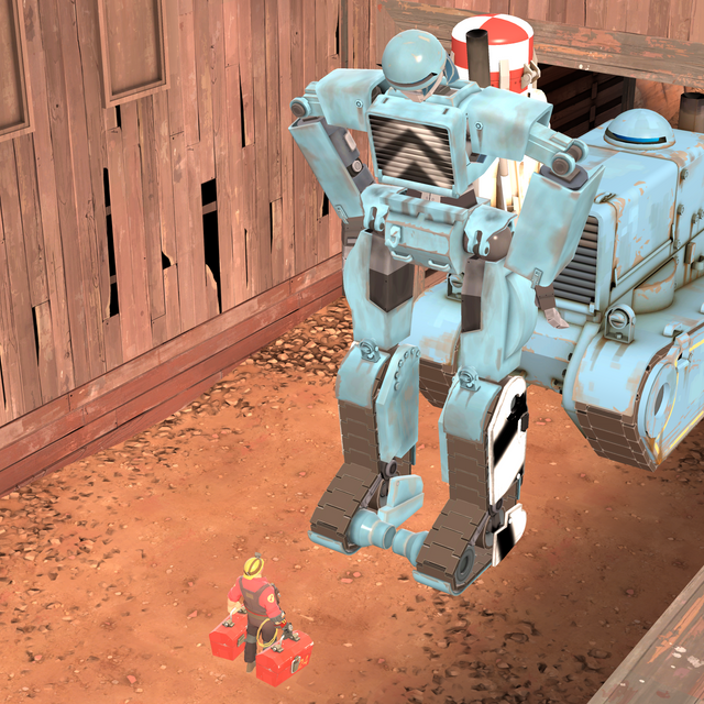 Engineer hears a loud clunking and heads outside, only to see a giant humanoid Tank Bot there. He's about to call the other when Repp appears on the Tank's shoulderRepp: Hey boss! Check out who I managed to reprogram!