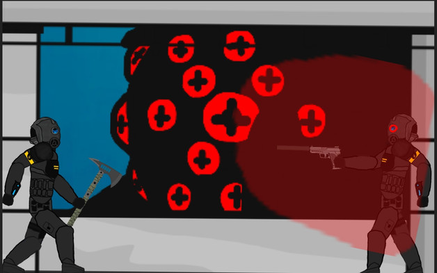 You shouldn't have mentioned the gun. If you hadn't pointed it out I wouldn't even have noticed that it doesn't look good. Ha, ha, seriously though, this drawing is kind of cool. You did a good job with the lighting. I don't know what game this is from. That guy's hands aren't attached to his body but he isn't Rayman. The other guy, looks like some sort of evil soldier.