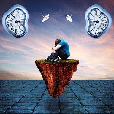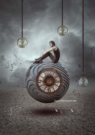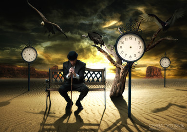 The way you chose to materialize the idea of "passing time" is original. The stance of the model is suggestive and matches well the desolated, supra-realistic landscape. The ghosty clocks stabbing the chess board complete this impression.