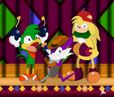 For some reason I've never really got into the Sonic The Hedgehog games, but sometimes I buy an (imported) issue of the main series comic book when I happen to visit around the store that sells them. This picture is based on the Champions story arc, which if I'm not wrong was inspired by the Sonic Championship arcade game, since it includes the "Team Hooligans": Nack The Weasel, Bark The Polar Bear and Bean The Dynamite.Sonic The Hedgehog © Sega