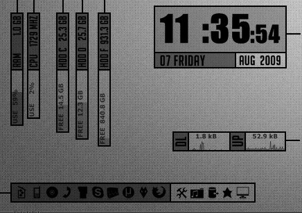 Just some conky + pure lua. The primary goal was to make vertical 3D-bars showing CPU usage in percent. Have fun with it! See lua_widgets.lua for options in Configuration section.Start it with conky -c start_conky.