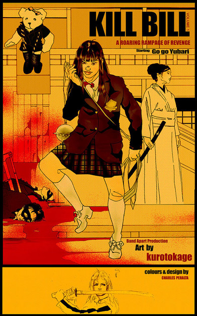 I can definitaly see the Kill Bill influence. Cute, very well layed out. And it looks like there is blood on the picture itself and not just the figures and objects in the drawing.