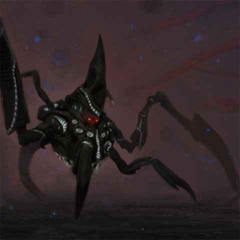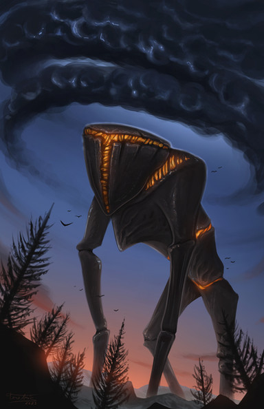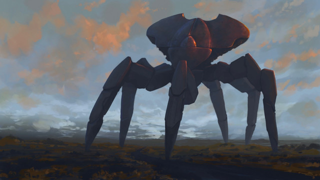 I love this design. Despite the ominous red and spider-like origins, this robot seems oddly curious. Of course he's probably a sentry robot equipped with far too many weapons, but I like to think that he's a curious explorer robot lost in the fog, instead.