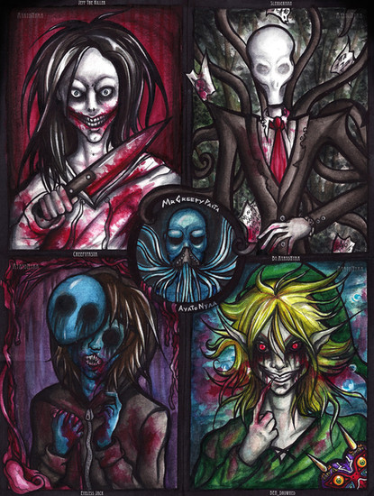 Jeff the Killer, Smile.JPG, Slenderman, Ticci Toby, Clockwork, BEN Drowned, Suicide Squidward, Herobrine, Bloody Painter, Eyeless Jack, Apple...