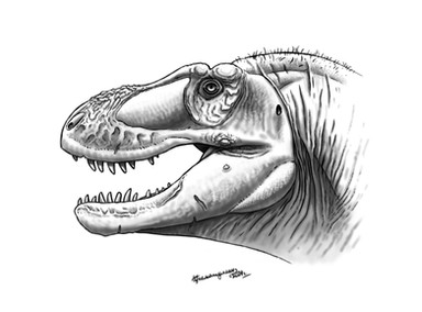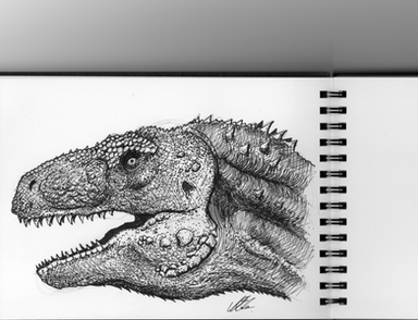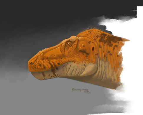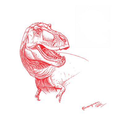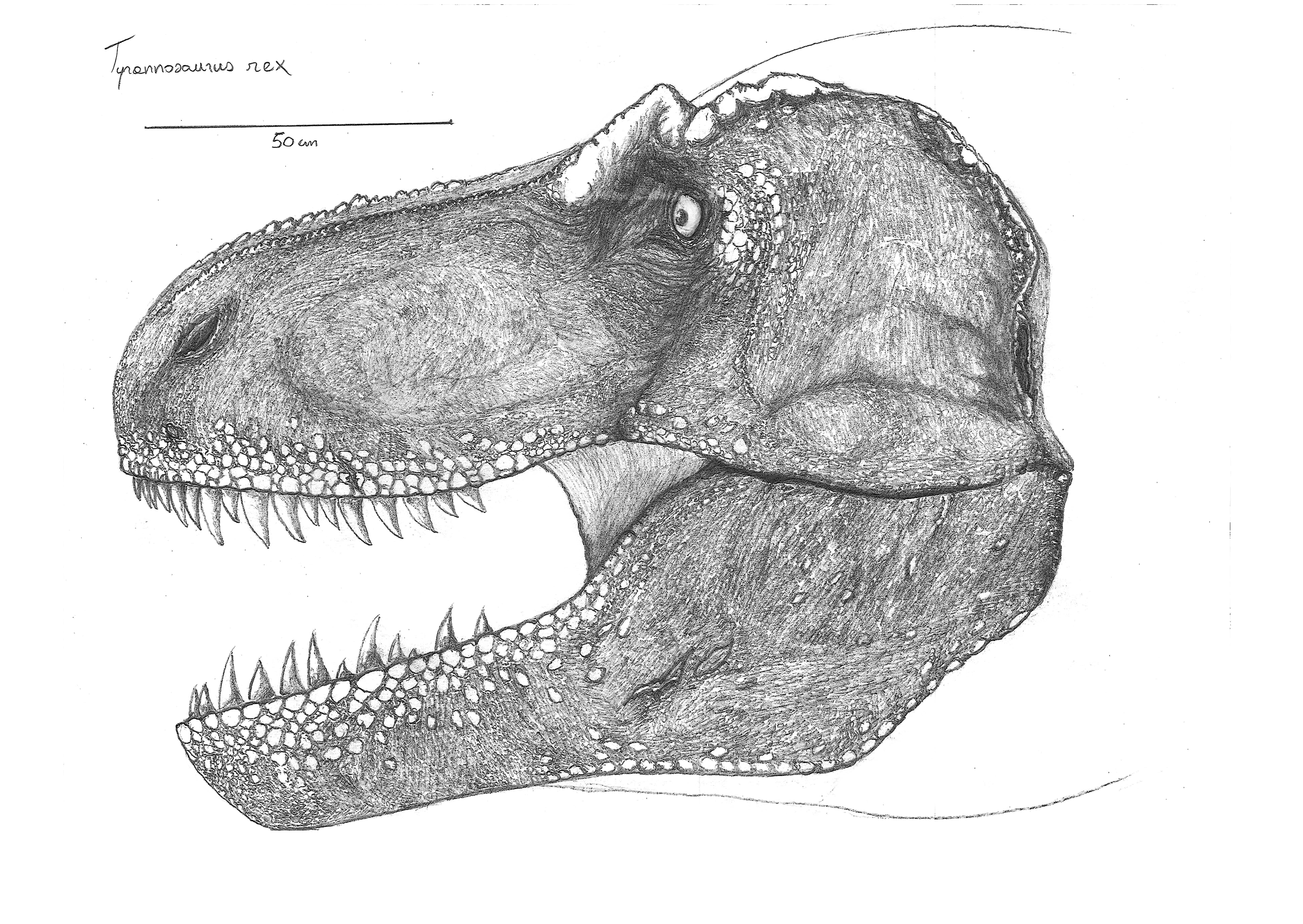 In this portrait I have focused my current wiews on the facial integument of a Tyrannosaurus rex. The figure shows rough, keratinized skin and exposed teeth. However, my version is different from Carr et al, 2017. In addition to the cracked keratin of "crocodilian" type with mechanoreceptors along a maxillary teeth row, there are maxillary structures that have left depressions in this bone in some tyrannosaurids (more details can be found in this video WitmerLab: www.youtube.com/watch?v=xTsVzx⦠, as well as in the corresponding article on the blog of Mark Witton). Top of the muzzle shows a keratinized skin, particularly on nose. The lower jaw Integument, however, is slightly different. The covers around the eyes is more "traditional". For those who this view seems inconsistent with reality: this is just my opinion, I could be wrong.