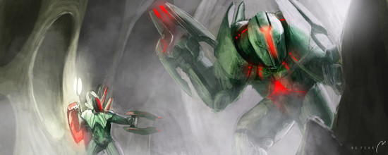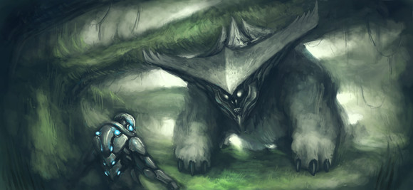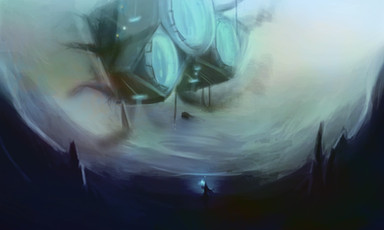 This is a really awesome piece. I love how it's greyscale except from the ship lights, and the misty background seems really mysterious and alien. The cliffs off in the distance seem really foreboding, which make the piece quite eerie. Then, last but not least, the massive, xenomorph-looking alien on the rock looks really, really awesome. I like the design you used, because it looks scary enough for a movie, but also practical enough to maybe be real. I also think the size difference between the alien and the unsuspecting traveler underneath helps even more to make this an impactful piece. My only suggestion is that maybe it would be even better with just a couple more splashes of colour, but maybe not, that's just a suggestion. Anyhow, this is an amazing piece of artwork, and please keep up the good work! ^^