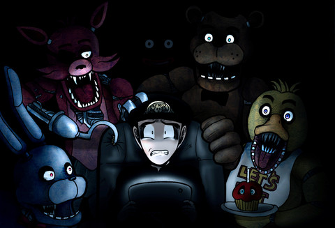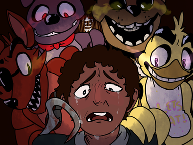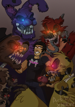 Amazing. I've seen a lot of Five Night's at Freddy's drawings with Mark, but this one takes the cake. Bonnie and Chica's (did I spell that right?) eyes glowing sends a make the hairs on the back of my neck stick up. The eyes on Mark show fear, well mine would show fear as well if I was in that situation, and sweat on his face, so real! It took me a second to realize that Golden Freddy was behind Mark. Golden Freddy's eyes will keep me up tonight for sure! The originality isn't five stars because I've seen a lot of this kind of art. But amazing job! Also this is my first critique.