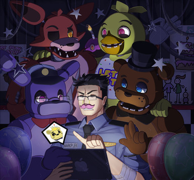The affect on Marks face shows that he's definatley nervous and facial fetures bring art together (Well, if its a picture of a person.) And, the animatornics look suspicious of him. The shading is spot on and you also show you always dont need really detailed eyes for a good drawing of somebody. And the golden freddy in the back made darker than the rest gives a GREAT effect too the drawing. Marks sweat on his face also shows nervousness on him. I also love the detail of Chica with a pizza on Marks head. Overall this is an amazingly drawn picture