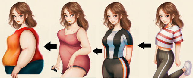 It is very nicely done but I ahve one complaint: You do not put on weight on your lower legs until the last or second to last stage. That is why chubby women tend to look a little bit unproportional, their lower legs are still thin but their thighs, stomach, ass, chest, face and upper arms are thicker. This is also personal, some put on all their weight around the stomach as that is where the insulin is made and the insulin pushes blood sugar into fat cells as quick as it can, not waiting for the sugar to reach the limbs as high blood sugar is toxic.