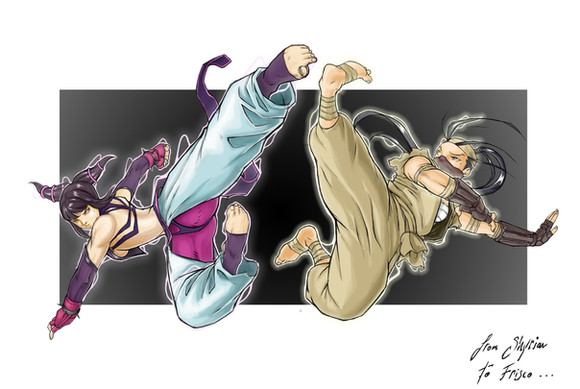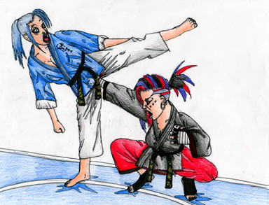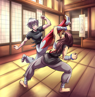 My official come back, finally finishing this piece.That's my OC Kim, training with.... her friend Ximena .... they take training seriously o_O