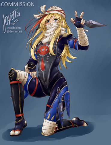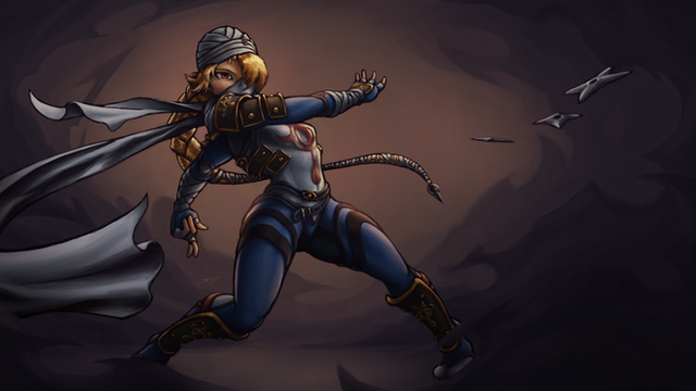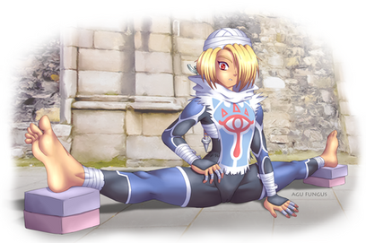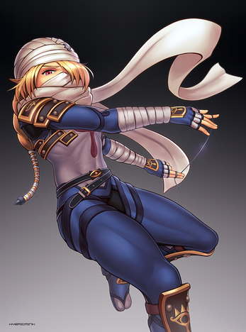 Seems like your coloring and details just keeps improving and it really shows on this one. The pose for Sheik is looking really nice and I like the small details like visible leg muscles and abs. Even the muscles under the arms is visible and it's quite the impressive amount of work you put in on this! That and the way you draw soles continues to impress. The wrinkles are in that perfect spot where it both looks like a lot, but in a way that comes of as natural and not excessive, and the shape of the toes too are looking very very great! And the clothing with the little cross shape on the head dressing, and the armor plating on her and the belts, it's all looking quite nice and I have to say some fantastic work!