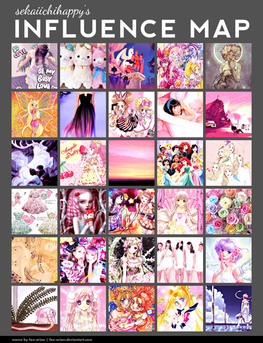 Me animé a hacer el Influence Map también ><. No pude evitarlo ^^.Love live: aunque hace poco que veo el anime, admito que llevo mucho tiempo admirando los diseños de personajes de Love Live, entre otras cosas por la cantidad de detalles que ponen a cada uno de los nuevos conjuntos que crean, así como a cada una de las cartas que hacen para el juego. Creo que la forma en la que suelo dibujar el cabello intenta, de algún modo, intenta parecerse a los diseños de este anime / juego.