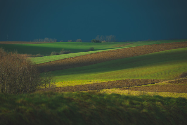 With the different patches of colors and texture in the grass, along with the waves in the earth, it makes me think of a patchwork fabric.