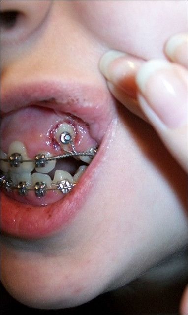 This is what the inside of my mouth looked like when i got the surgery for my canines. That's when a whole bunch of blood poured out of my mouth from the holes. I couldn't swallow my saliva very well because it hurt whenever my tongue touched the ceiling of my mouth. Horrible memories!This is called: impacted canines.