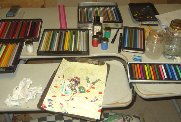 whao. XD hell, it's better than mine!...then again, that's because my workspace is my bed. half the time, I can't find the colored pencil I wanted and have to spend like 30 minutes sorting through the covers looking for it! XDD