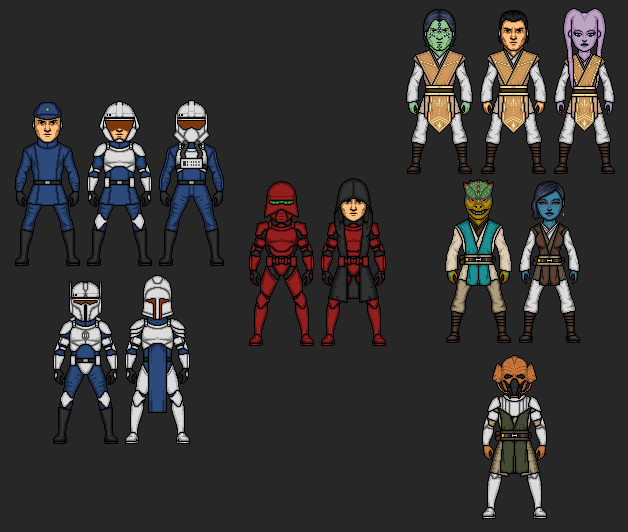On the Star Wars front I wanted to get a Jedi council made, so I made a few to go along with what I have already. But I still don't have names, lightsabers, or backstories for them with one exception...I played with the idea of the Empress being a former Jedi that left the order when she fell for a member of the royal family. This would explain why her children are force sensitive (a bit of a spoiler...but not unforeseen I'm sure). I also played with the Twi'Lek Lekku a bit so that I can have options later on if I plan to do more of them. My idea for their outfits has also evolved a bit. Originally I wanted them to reflect their classification within the order (Conusor, Guardian, Sentinel), but then started having fun with it and realized it was a bit redundant given that the lightsabers do that already with their coloring. So now I'm shifting more towards the outfit is representative of which temple they are associated with. Of course then I gotta figure out which planets have temples, and who doesn't get representation on the council. So for now I'm gonna do some more research and the robe styles mean nothing. I also included a female trooper armor, I personally don't like the idea of a feminized trooper. I prefer they all look the same regardless of gender or race, like when you look at Phasma or a cosplayer (a 501st member, not a "Sexy Stormtrooper" that seems to be the default Google search). So I really made it for Jedi purposes.