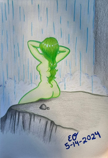 This is fanart of Myrrh, a new bit-character in the comic The Wotch. She is a maid for a psycotic archmage named Sykos. Said Archmage once mixed up all his magical reagents into one huge pot, added a pinch of Ginger, and let it sit overnight. When his maid went to clean it up the next day, the resulting goo attacked her, and, er, won.The result is Myrrh, a plesantly smelling (Myrrh is also a spice, this is a pun), amorphous humanoid made of transparent green goo. In the comic she doesn't have legs so far, but, the pose I was using did, so... In the comic she can create clothing and tools out of her own body, so in my mind, making legs isn't a huge stretch. Creating tools is actually somewhat cute, since she does apparently leave a thin layer of goo on things she touches -- although it's possible she "pulls back" the goo when she's done.