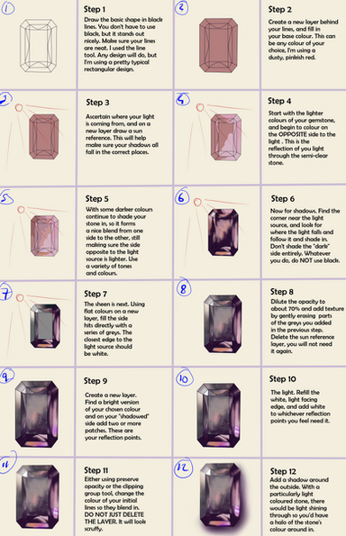 You could, if you feel a bit unsure about what effect each stage does, do them on separate layers and then just combine them at the end (if needed). My drawings usually end up having more than 50 layers which causes the paint program to lag a bit, so I try to merge layers whenever possible. Also, I've done this so many times that I don't really need separate layers for it. Unless I'm adding gems, those I do on separate layers of course, in case I need to move them or change their colour...