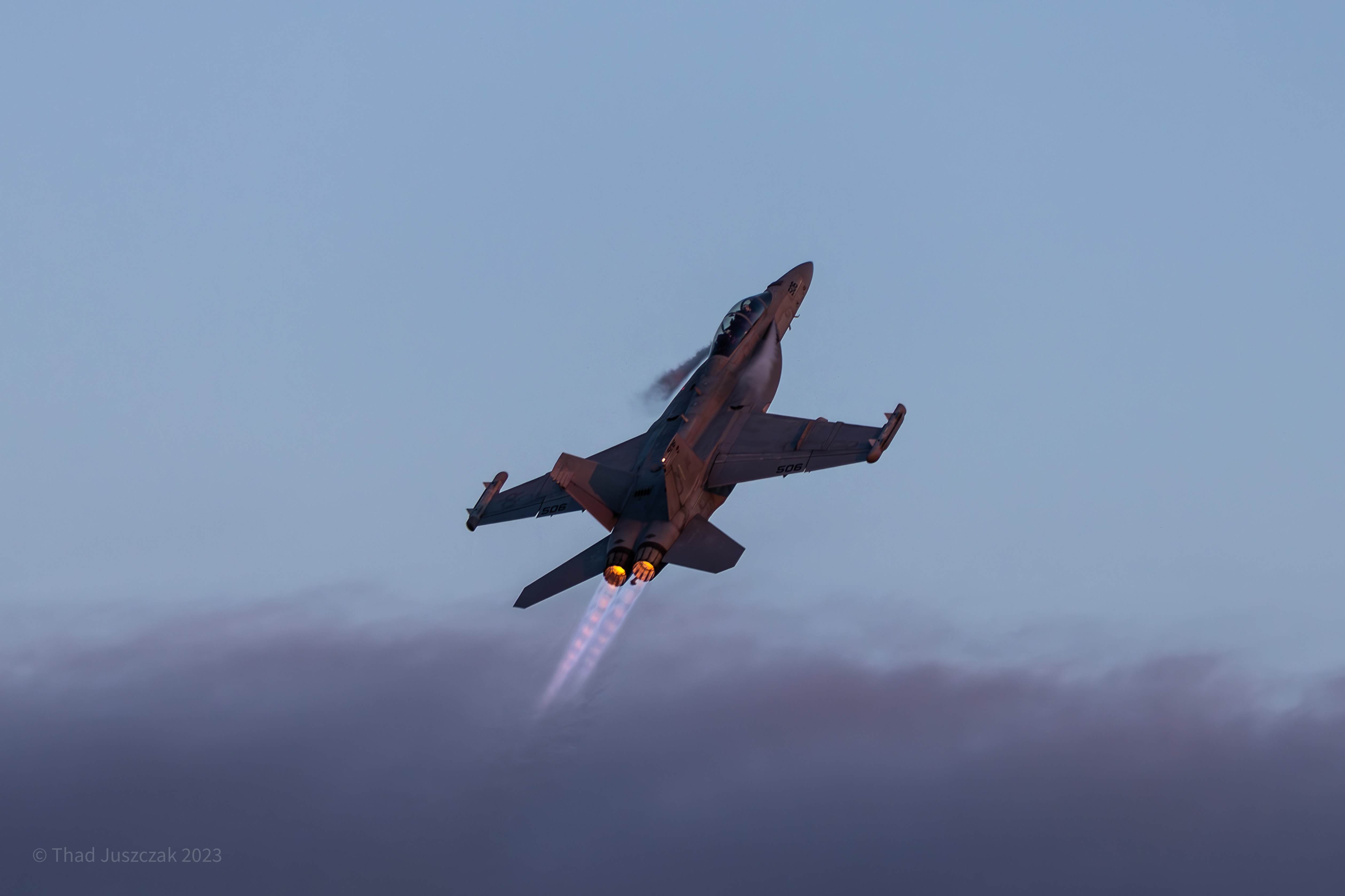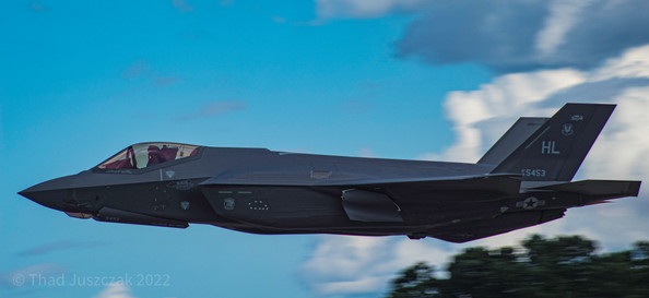 A USAF F22 passing by with afterburners a glowing at EAA Airventure 2023