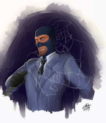 I really like the slight differences in this picture, like the shading of light on the 'blu' side. And how the blu spies left arm doesnt match the red spies right arm in the picture. It shows that they are not the same person, and that spies can change into anyone the wish, and ever become different them selves, I REALLY like this one out of the series <3