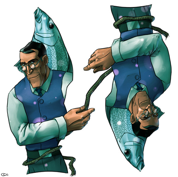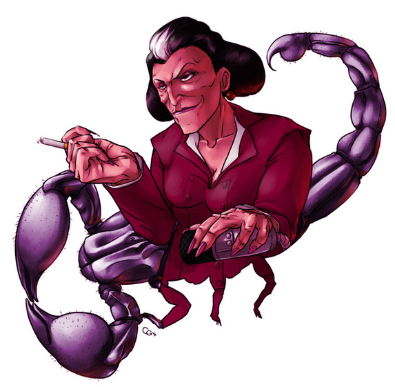 While I did use the same lineart for both spies, I edited them to be subtly different. The stereotypical Gemini is quick-witted but so duplicitous that even he is left unsure of who he is, so I felt that it was the perfect sign for the Spy.