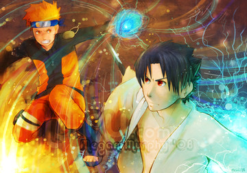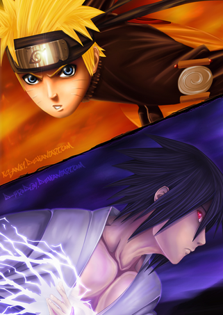 Beautiful and epic representation of one of the most powerful rivalries in anime.Ā Nice job capturing the flow and power of Naruto, Sasuke, and their signature jutsu.