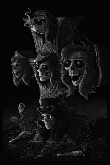 Another GNR drawing. This one I made as a gift to make a personalized tank top for my girlfriend. I used a pic of the band and replaced the faces with skulls, a sort of hommage to the concept of their Appetite for Destruction album cover.Related content