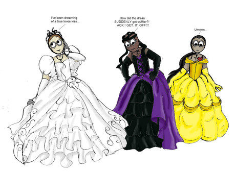 He's just embarrassed and shy. XD Secretly, he KNOWS it suits him. :3 Personally, I see him as being best as either Belle (it seems we agree, but I prefer the blue dress) or Jane, from Tarzan. XD Think about him, him and Mariku/Melvin work GREAT as both Belle & Beast AND Jane & Tarzan. XP