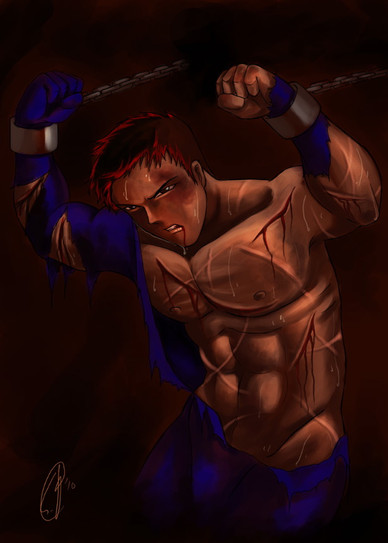 Very impressive work! The darkened place , with only an weak source of light is like a dungeon... a rotten, smelly, moist prision room or interrogastion room... this REALLY add an eerie and terror touch... as well the turtle pose... on his knees, totally submitted, controlled , tied, unable to use his powers... except one... the last, defiant standing on his eyes, almost like "come on, bastards, do whatever you want do, I will NEVER say anything!" Woa, I could almost see fire coming from his eyes and gritting teeth! fantastic work ^^ I also liked the care on his muscles and wounds... appears the torture was hard... and was not even the beggining