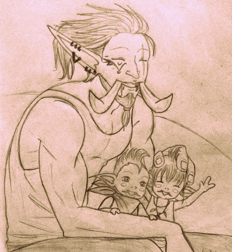 Just a quickie sketchy thing of the family getting stuff for dinner~Except Meiles. No way he's getting in that water!