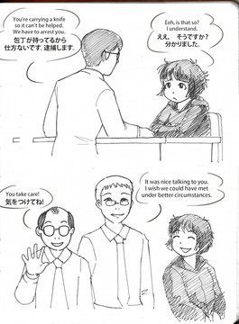 My arrest happened at 3:30 am but there was a lot of cataloguing (of my belongings), biometrics, and paperwork to do before interrogation, plus we had to wait for Police Chief Yamada to come in.
