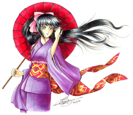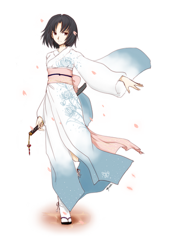 Commissioned by ~pehpigAt first I had her yukata in a salmon color, but I was asked to make it sky blue. I tried putting in the salmon flower pattern on it to hopefully tie it in with the rest of the color palette. I hope it works and doesn't clash too much!