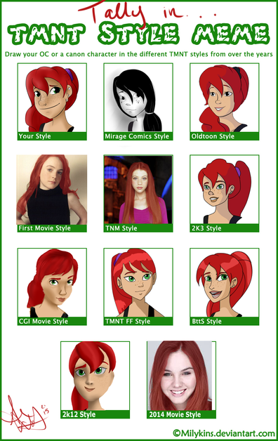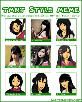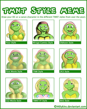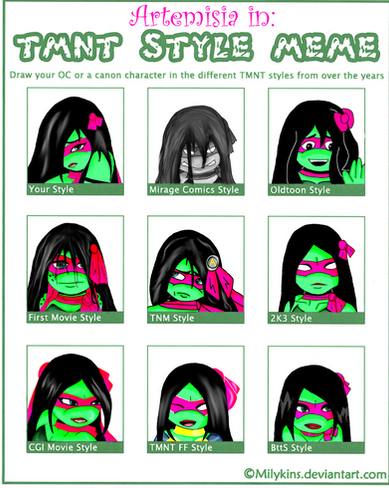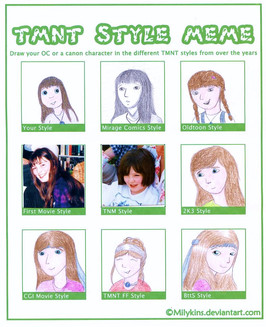 Because my front page is starting to get full of lineart, I thought it's time to do a meme to add a splash of color in thereSo... Here's Yoko (yes, again, bear with me!), my TMNT RP character in different TMNT styles.