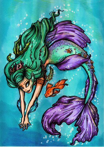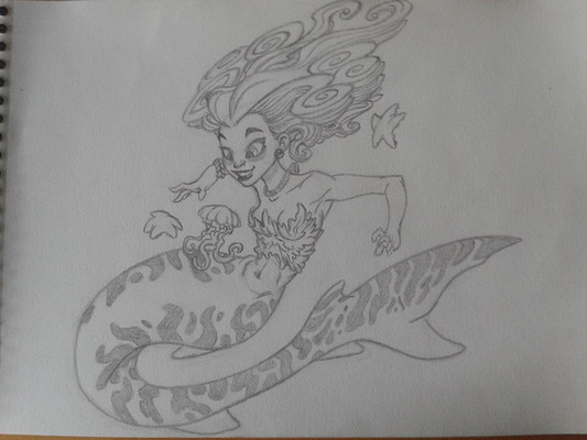 Aw man; seeing your WIP's is so inspiring; All the little details you put into your drawings is amazing! I LOVE how you outlined this; it looks so soft and smooth, and the subtle shading is perfect! It really helps bringing so many dimensions to this drawing, and the changing thickness of the outline really is stunning and just... daw... just damn beautiful! Her design is WONDERFUL and I love the more maritime look, which stands out from the 'regular mermaids'. Oh and that fish... I don't know why, but that is just fucking cute!