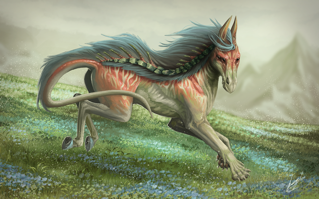 I've been working on this creature's design recently. I wanted to finish it before drawing it in a full painting. I'm still not sure the if colors will stay the same tho.. 😆These beast are known for their speed and they make excellent mounts.