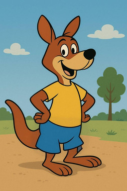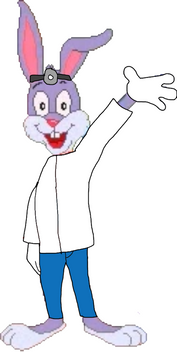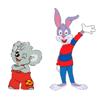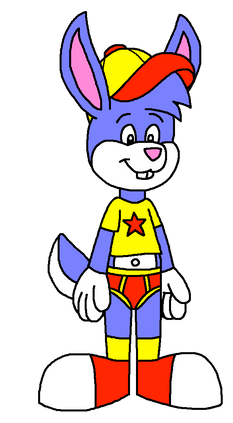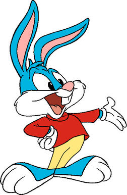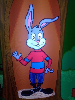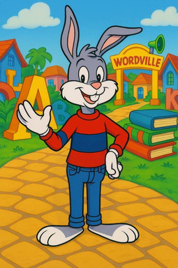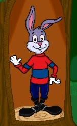 Reader Rabbit wears a red and blue striped sweater, gloves and jeans.El Conejo Lector usa un jersey rojo y azul rayado, guantes y pantalones vaqueros.
