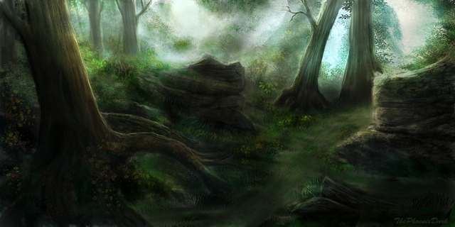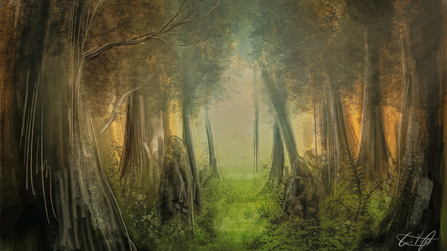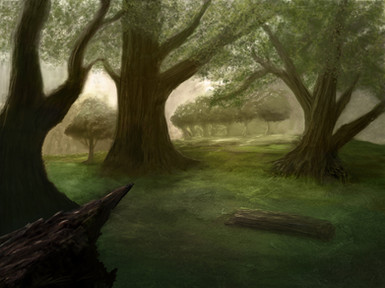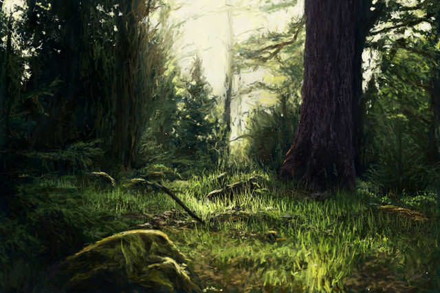 I liked the texture of the trees, a little loose in some parts maybe [some of the branches for example] but I found the bark of the closest tree quite interesting; a little odd though the area where it roots itself into the ground, my current opinion at least -- maybe that's because it seems to "dissipate" into the ground, kind of fade away in a slightly ethereal fashion, the shadows there don't reflect the shadows of the same tree higher on the trunk. The tree behind it on the right might also be a little too green for my liking, I'm not sure, or maybe it's because it seems More green lower in the trunk due to the downward angle of the branch in front of it and the loose painting of the leaves on that branch melting into the tree behind?