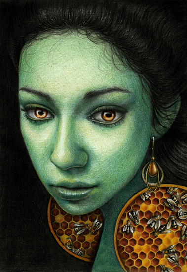 I love this kind of art where it's mostly black and white with one color standing out; it's a really nice effect. I love the smiling green fish and how detailed they are. You did an amazing job on their scales--they have great detail! I also like how the mermaid/lady's green eyes, and how well you drew the strands of hair in front of her face.
