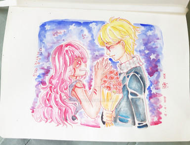 Hello guys!After a long, long time of drawing my Ocs or different characters, I decided it was time to... finally draw one of my favorite couples: Luka and Gumi! They are having a romantic moment together, and so that's why I drew these girls being surrounded by lot of roses (and not to forget the fact that I LOVE to draw people in love and nature )