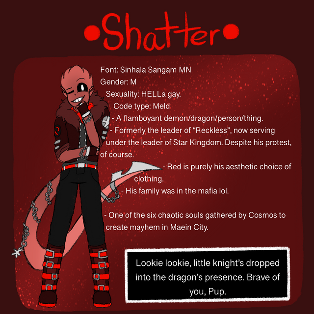 ๑ My basic idea for Fall was to turn him to a 'take no shit' feral energy dumbass whose only control is Kinishi. And also that his entire appearence was basically the opposite of Cosmos- since while Cosmos is the flamboyant bastard he is, Fall is meant to be the 'second child' and has an :sparkles: inferiority complex :sparkles: