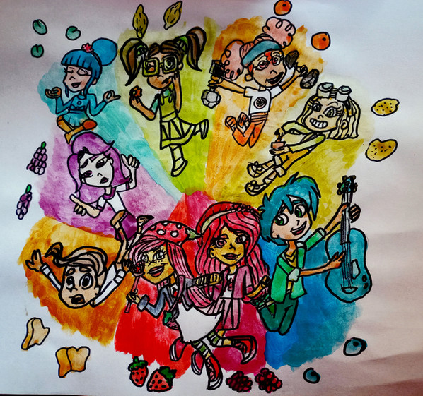 From the bottom working around clockwise: Strawberry Shortcake (left) and Raspberry Torte (right), Bread Pudding, Sour Grapes, Blueberry Muffin, Lime Chiffon, Orange Blossom, Lemon Meringue, and Huckleberry Pie. All of them are leaping from a massive explosion of fruit, apparantely caused by Lemon, the only berry who can make anything go boom.