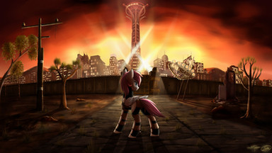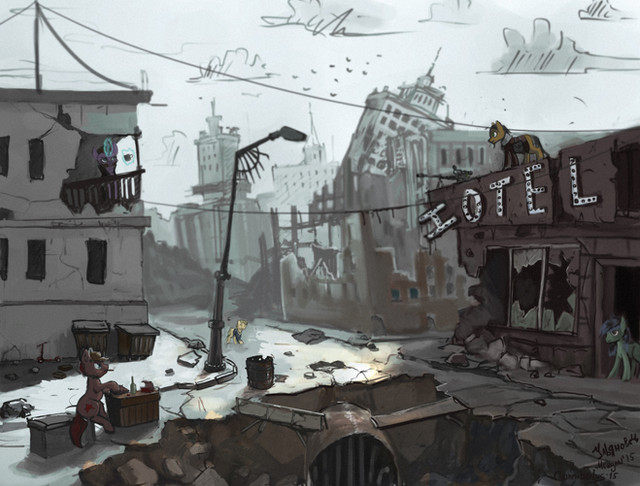 Хотелось изобразить промежуточный этап между привычным настоящим и обществом копытной Гармонии: как Земля постепенно превращались в Эквус, строя на руинах прошлого новое будущее. Скажем, ~400 лет после условного Дня Солнца и Радуг. Что ж, базис вселенной есть, быть может, это даже выльется в серию тематических работ.