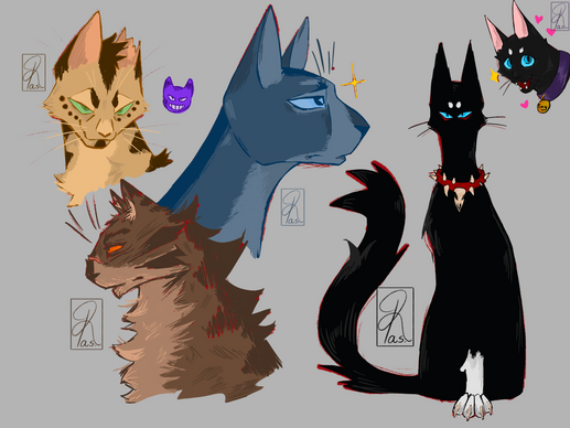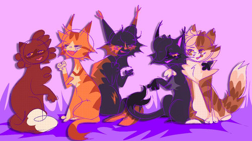 Hi, I'm finally back, but I won't be able to draw for a few days, so no new pages sry ):Have some of my favorite assholes from ThunderClan instead - Flowerbloom, Fieldstar, Denis and Willie.