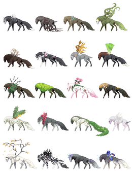 Clockwise from top: esk 232 (mine), esk 072 ( jasmine-blight ), calico kitsirin ( Ryuukishin ), esk 025 ( norree ), gemini kitsirin ( rejamrejam ), esk 079 ( Lei-Leiurus ), and in the center is warrior-saint 's bepotelkh fawn, Pany. Β I'd think this was obvious but even though they're small, please don't take or use these unless the characters are yours!