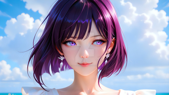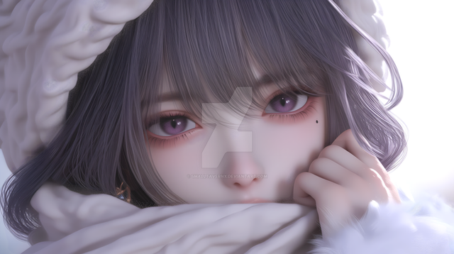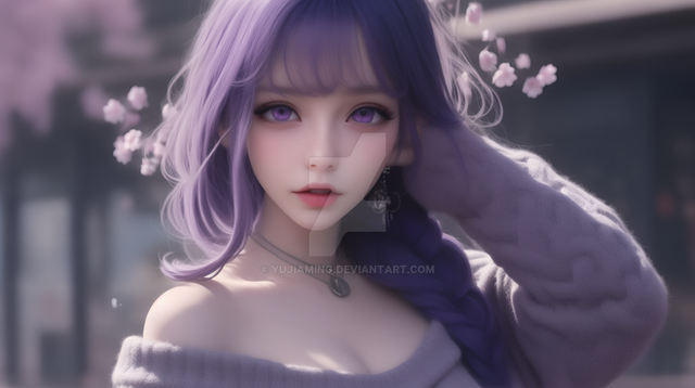 #blue_eyes #illustration #long_hair #purple_hair #anime_style #pretty_girl #dreamy_girl #soft_focus #high_resolution #braided_hair #casual_style #soft_skin #modern_outfit #genshin_impact #raiden_shogun #subtle_makeup #ultra_detailed #close_up_face #cinematic_portrait #cozy_sweater #dreamy_expression #cg_render #natural_bangs #lavender_top #knitted_texture #pom_pom_earrings #gentle_lighting #soft_girl_aesthetic #cute_beauty #aesthetic_character