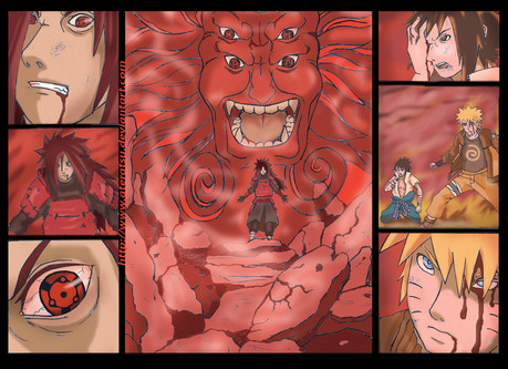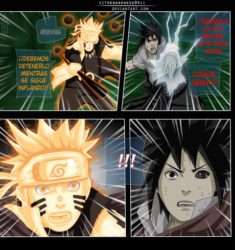 Another battle between Naruto and Sasuke. Gaara helps out Naruto. Sasuke attacks Naruto. Gaara shields Naruto from said attack. Gaara is relieved to see Naruto unharm before falling to the ground. Naruto turns Kyuubi mode.